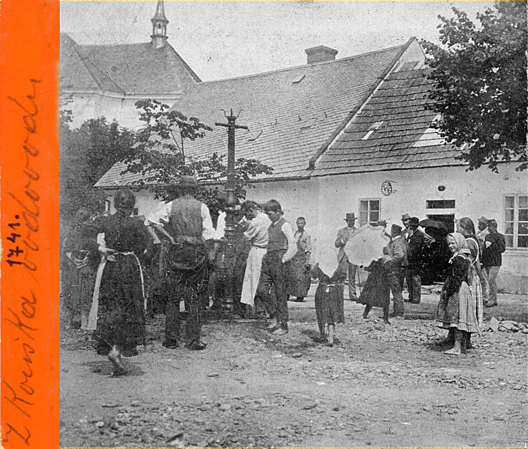 Vysoké nad Jizerou, zkouška vodovodu roku 1894 na Malém rynečku v Zákostelí před čp. 4 a 5, foto Josef Hladík (inv. č. VMV 1741, fol. 1ra).