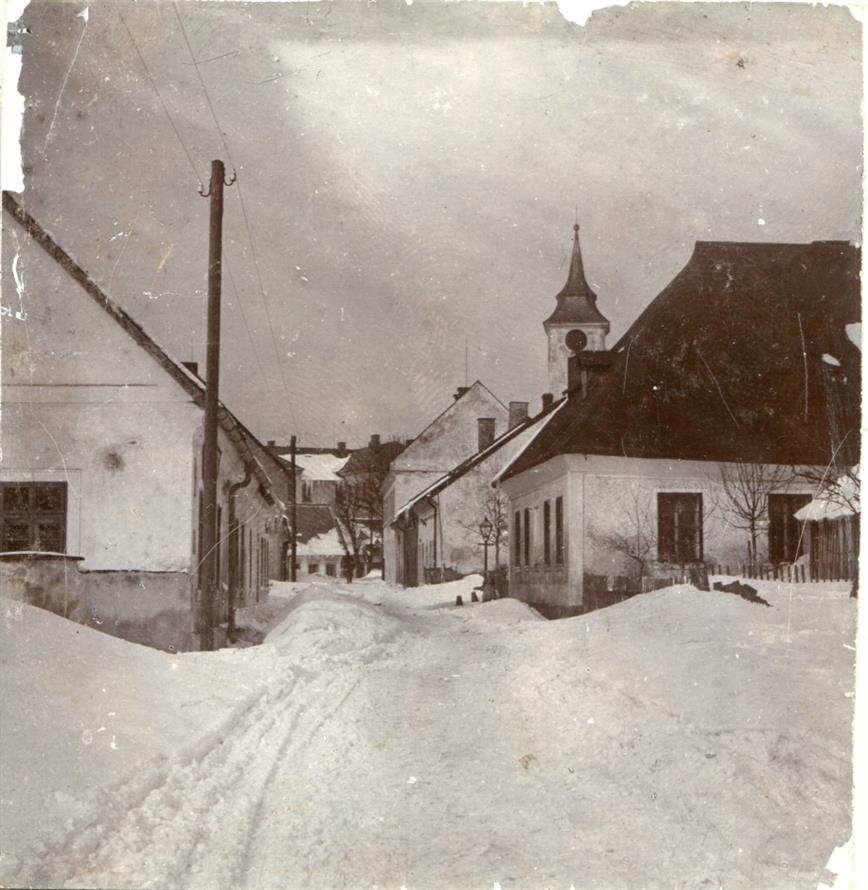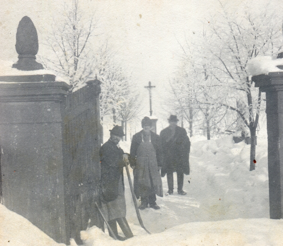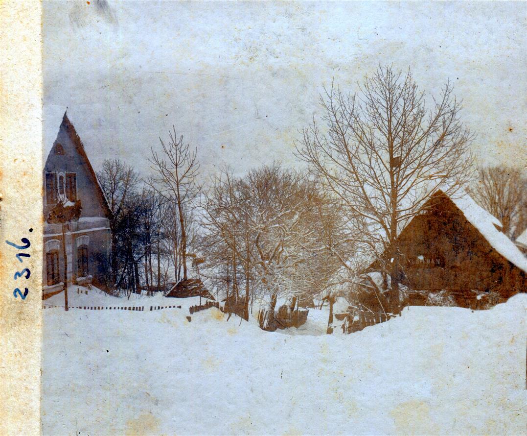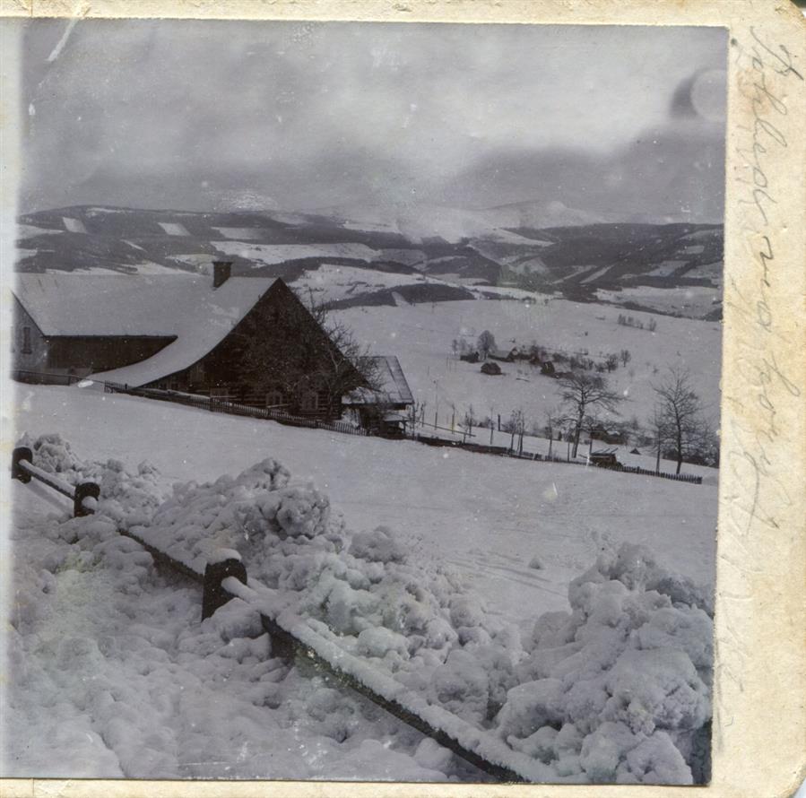 Vysoké nad Jizerou, sněhem zasypaná cesta pod farou u „Marinku“ mezi čp. 16 a 200, foto Josef Hladík (inv. č. VMV 2316, fol. 1ra).
