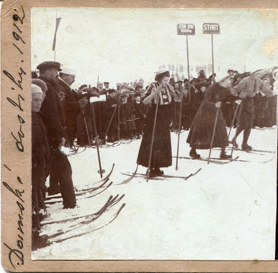 Vysoké nad Jizerou, start závodu, jinak dostihu, lyžařské jízdy dam na 1000 m roku 1912, foto Josef Hladík (inv. č. VMV 1894, fol. 1ra).