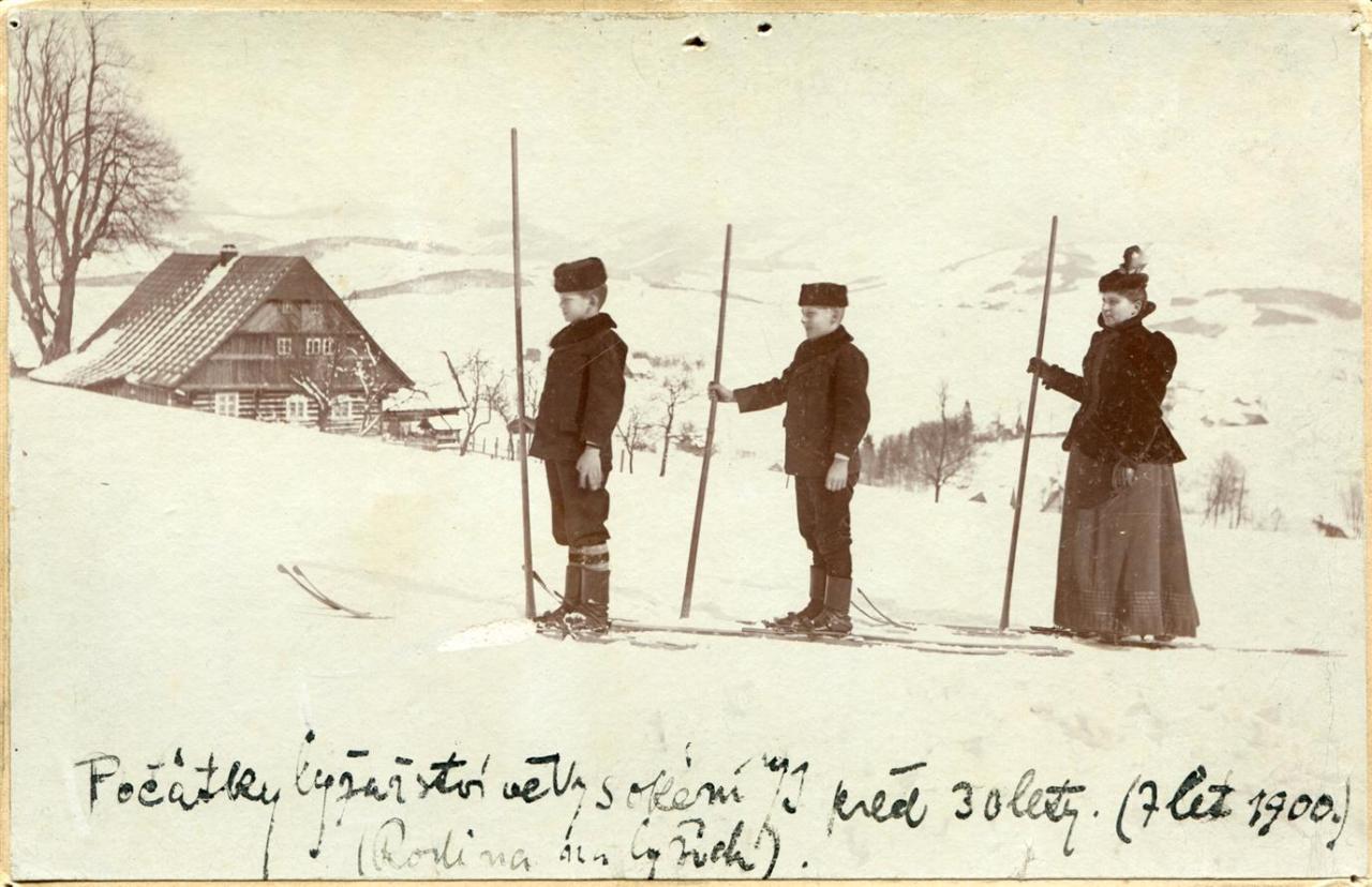 Vysoké nad Jizerou, matka se syny na lyžích s Nigrinovou lípou a číslem popisným 44 v pozadí, foto Josef Hladík (inv. č. VMV 1908, fol. 1r).