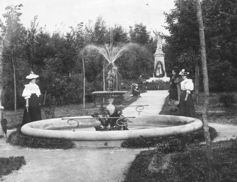 Vysoké nad Jizerou, vodotrysk v městských sadech před sochou Karla Havlíčka, foto Josef Hladík (inv. č. VMV 1911, výřez fol. 1r).