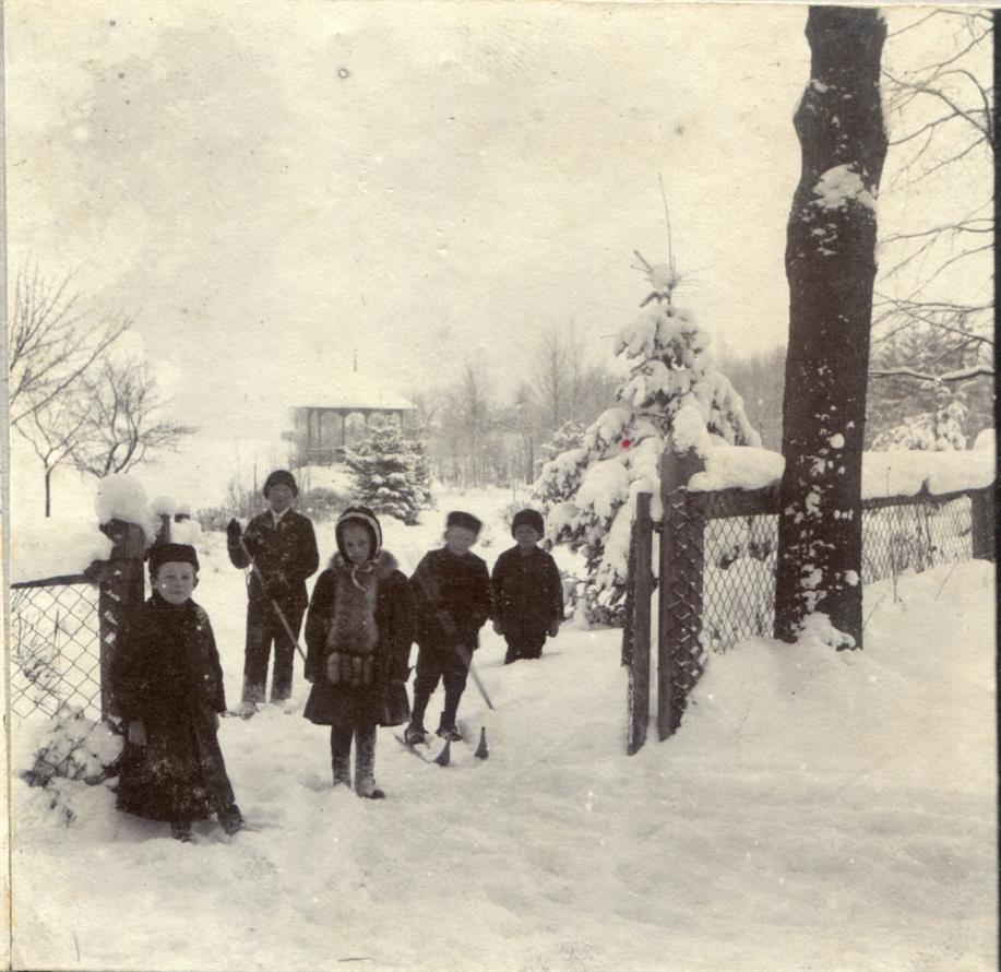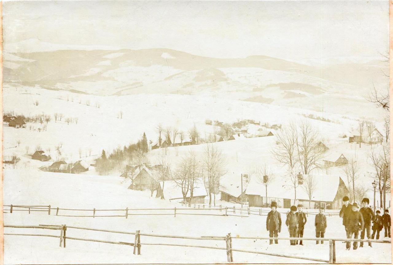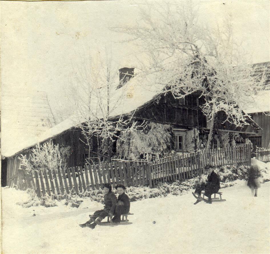 Vysoké nad Jizerou, fara čp. 7 a malí lyžaři i sáňkařka 25. 2. 1911, foto Josef Hladík (inv. č. VMV 1843, fol. 1vb).
