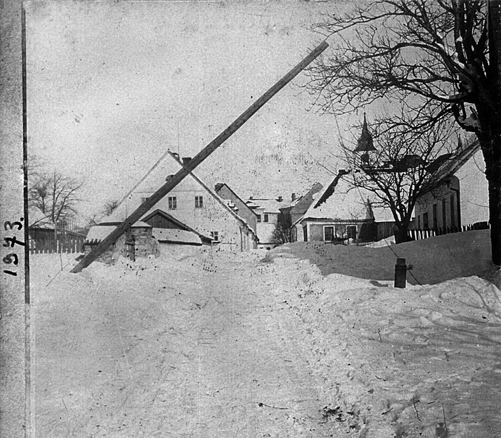 Vysoké nad Jizerou, ojíněné stromy u kostela svaté Kateřiny Alexandrijské a fary čp. 7 asi roku 1895, foto Josef Hladík (inv. č. VMV 2522, fol. 1r).