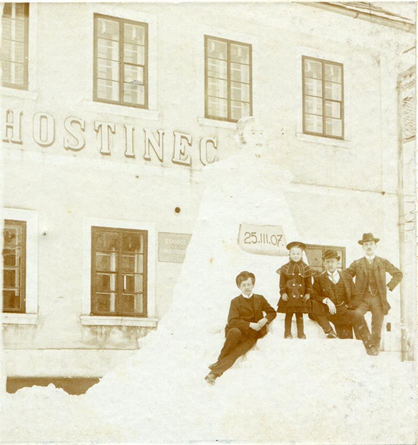 Vysoké nad Jizerou, stanice Klubu českých turistů v čp. 69 a sněhulák datovaný 25. 3. 1907, foto Josef Hladík (inv. č. VMV 1993, fol. 1rb).