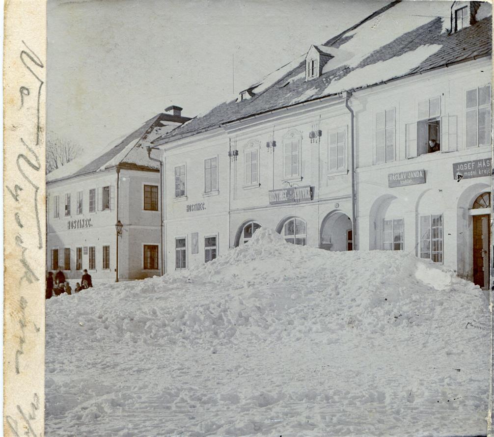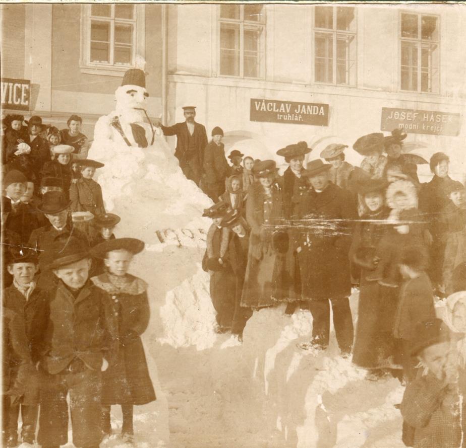 Vysoké nad Jizerou, sněhulák datovaný 1905 před čp. 65 a 64, foto Josef Hladík (inv. č. VMV 1994, fol. 1rb).