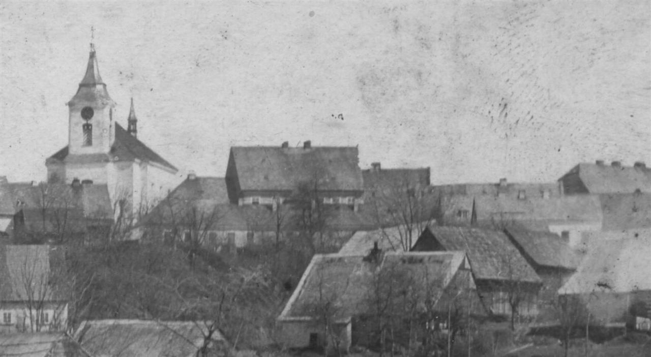 Vysoké nad Jizerou, pohled na kostel a c. k. okresní soud přes Staroveské návsí, foto Josef Hladík (inv. č. VMV 2058, výřez fol. 1r).