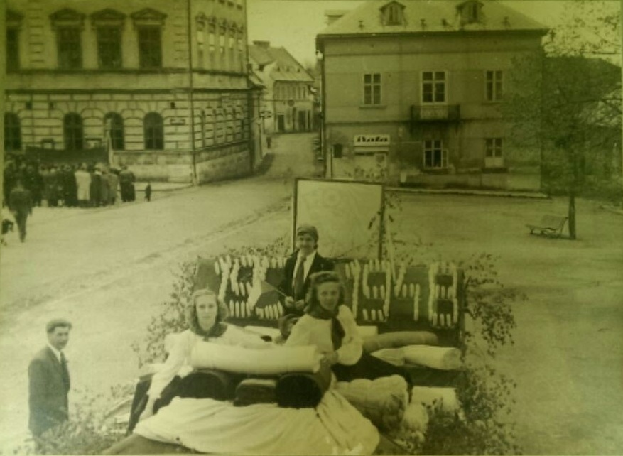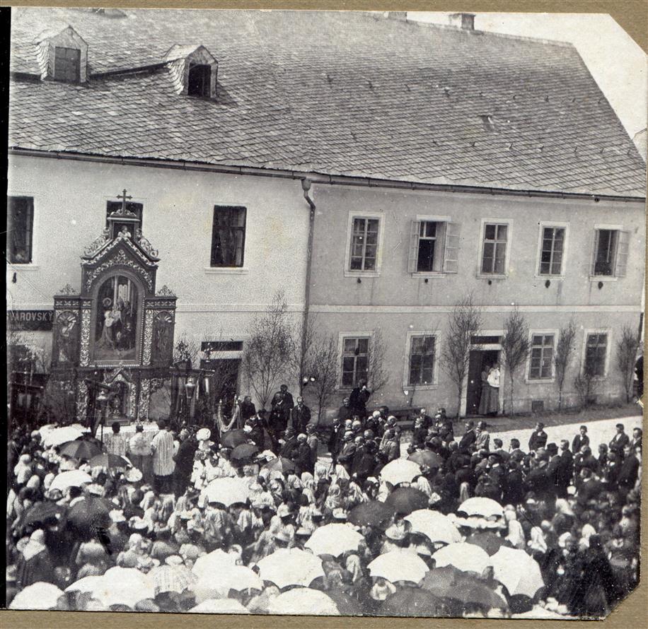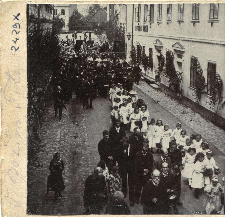 Vysoké nad Jizerou, kamenná dlažba s procházejícím božítělovým průvodem před domy náměstí a tehdejší „Havličkovy“ ulice čp. 125, 64, 58, 56, 55, 54 a 10 s ...