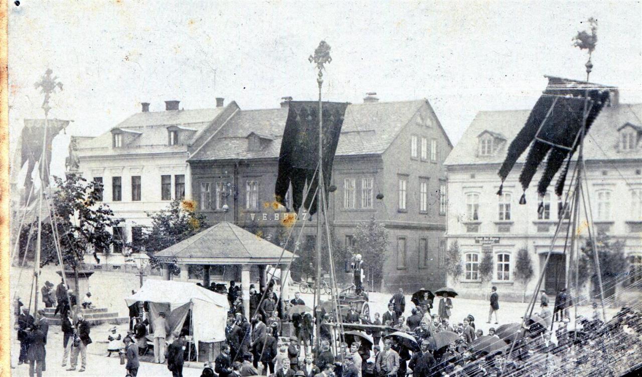 Vysoké nad Jizerou, cechovní ševcovský, sedmerácký a krejčovský žengrouty, tedy korouhve, a kominík na hasičské stříkačce před rokem 1901 při božítělovém průvodu na náměstí před čp. 58, 56, 55 a 54, foto Josef Hladík (inv. č. VMV 2426, výřez fol. 1ra).