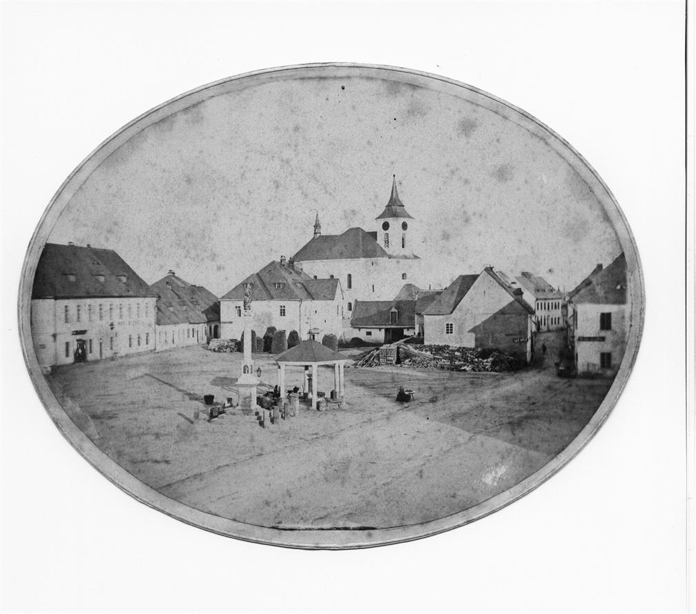 Vysoké nad Jizerou, náměstí a kostel svaté Kateřiny Alexandrijské roku 1865, foto Zeman (inv. č. VMV 3860, fol. 1r).