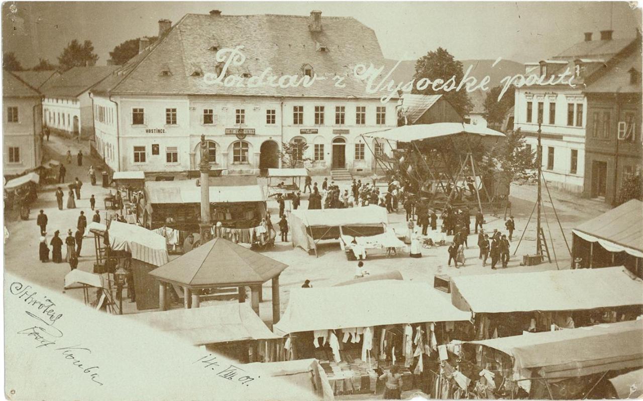 Vysoké nad Jizerou, severní roh náměstí s letními pouťovými atrakcemi na pohlednici napsané 14. 8. 1901 (inv. č. VMV 4180, fol. 1r).