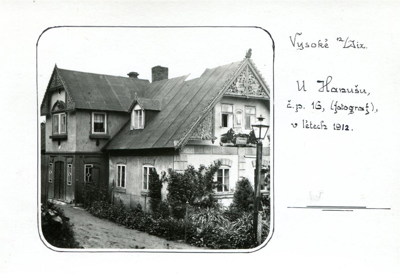 Vysoké nad Jizerou, dům čp. 16 řezbáře, sochaře a fotografa Františka Hanuše kolem roku 1912 (inv. č. VMV 6389, fol. 1r).