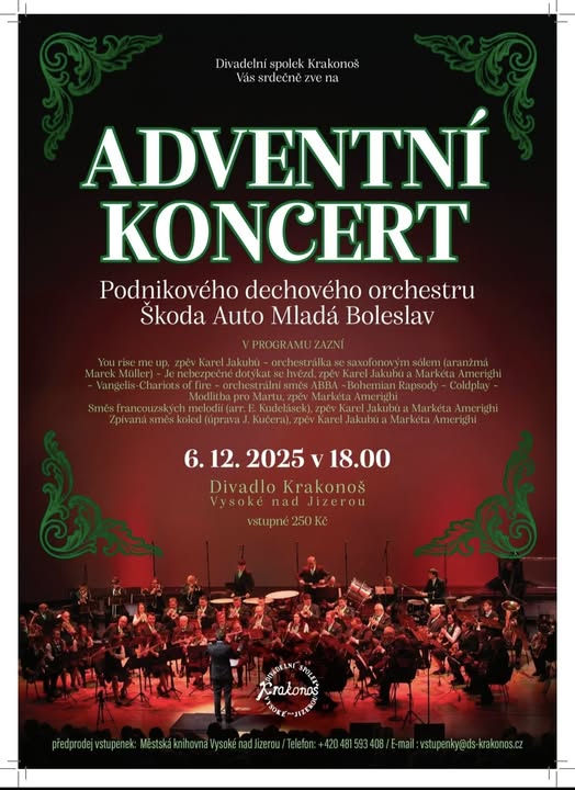 DS Krakonoš Vás zve na adventní koncert podnikového dechového orchestru Škoda Auto Mladá Boleslav do divadla Krakonoš ve Vysokém nad Jizerou dne 6.12. od 18 hodin. Rezervace vstupenek již spuštěna v městské knihovně. Vstupné 250,-