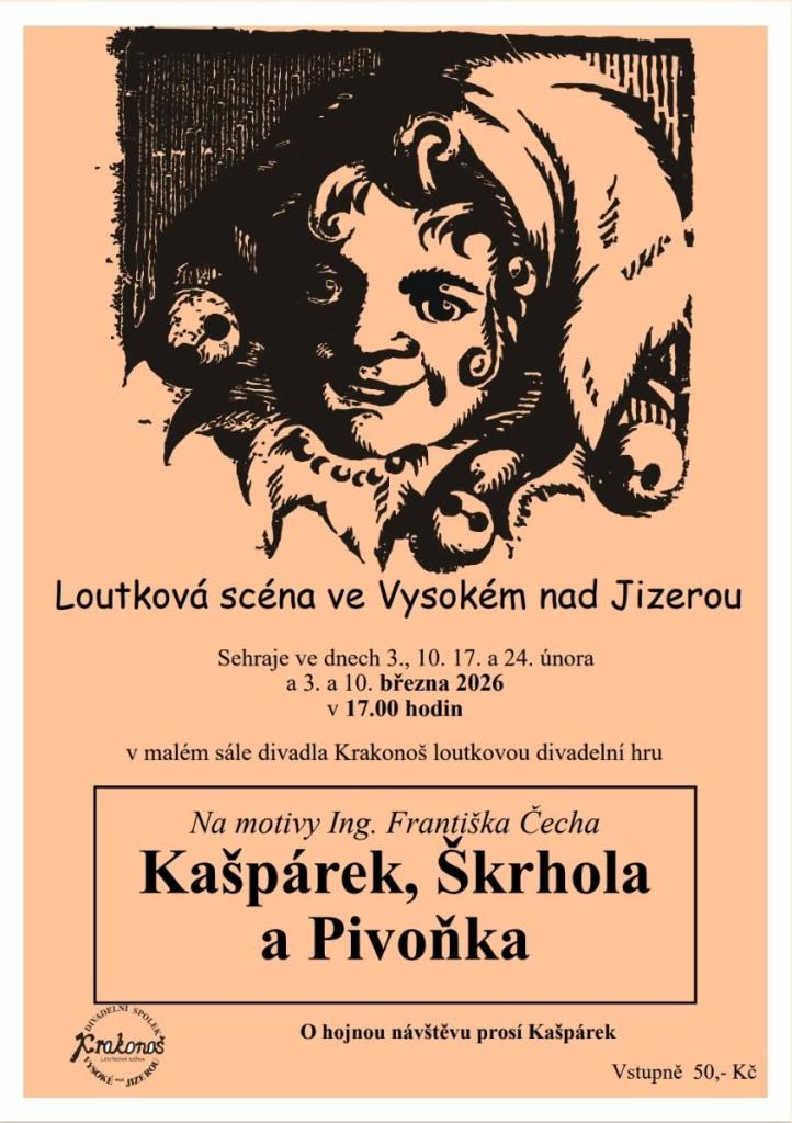 DS Krakonoš vás sve na malý sál divadla Krakonoš na loutkové představení Kašpárek, Škrhola a Pivoňka. Vstupné 50,-. Při velkém zájmu se hraje i od 18:15 hodin.