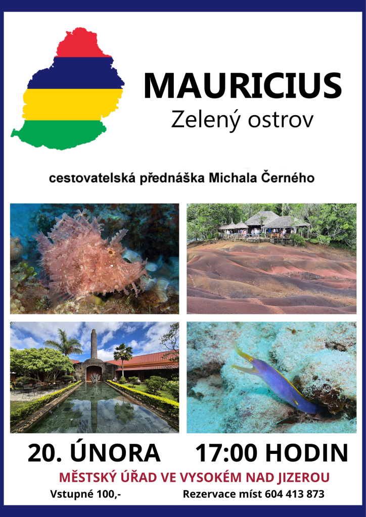 Cestovatelská přednáška pana Michala Černého nás tentokrát zavede na zelený ostrov Mauricius. Koná se 20. února od 17 hodin na městském úřadě, vstupné 100,-. Rezervace míst na tel. čísle 604413873