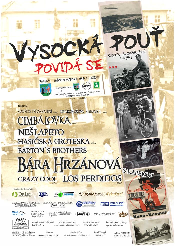 6. srpna se náměstí našeho krásného města promění v místo řemesel, živé hudby a tradiční pouťové zábavy. Hudba, povídání o té úžasné historii města Vysokého nad Jizerou, zpívání profesionálů i nadšených dětí a mnoho dalšího – taková bude naše další společná pouťová sobota. Přijďte pobejt na náměstí Karla Kramáře a dozvíte se, jak to bylo s prvním vysockým automobilem, jak se zde poprvé pila káva, jak se našim předkům měnil život, když končily povozy s koňmi a začaly je nahrazovat povozy motorové… Bude se ochutnávat, poslouchat, vyhrávat a pro každou dámu, jak jinak, jedna vystřelená růže?