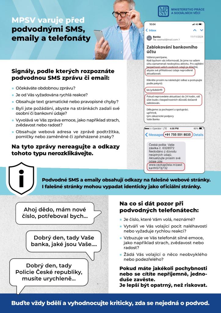 V letáku jsou uvedeny signály, podle kterých rozpoznáte podvodnou SMSku či email.